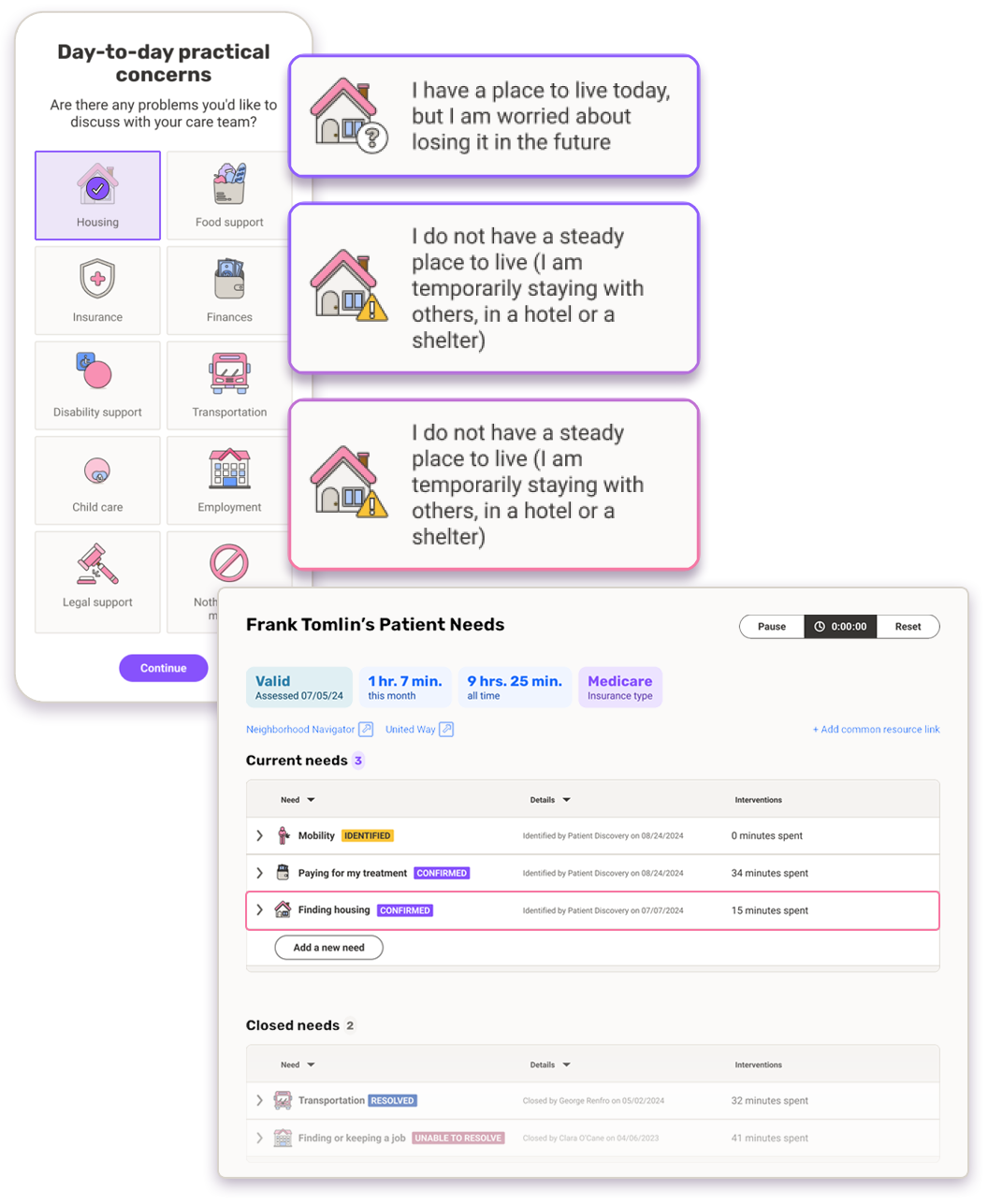 The Patient Discovery platform centralizes the patient needs management workflow for the entire care team, including non-clinical staff. By streamlining needs intervention and coding, we help oncology practices work more efficiently and optimize reimbursements—all without increasing administrative burden.